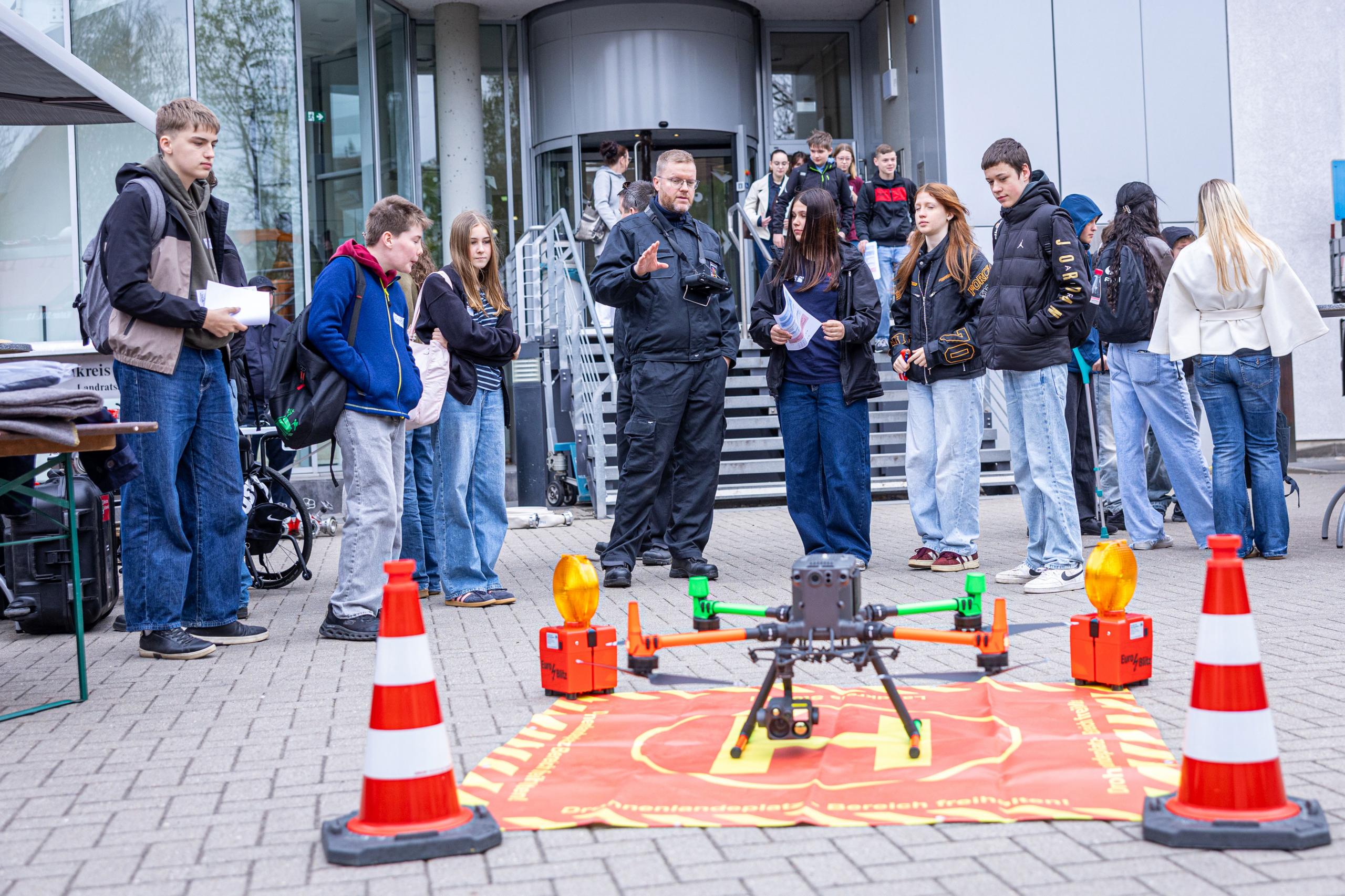Für die „Mission Kreisverwaltung“ wurden die Teilnehmer in acht Gruppen eingeteilt. Mit einer kleinen Schatzkarte ging es darum, an den zwölf Informationsständen der verschiedenen Ämter Fragen zu beantworten. Mit dem Lösungswort gab es am Ende ein kleines Präsent. Viel wichtiger aber war noch, dass die Jugendlichen vieles selbst anfassen konnten. Der Katastrophenschutzstab führte sein Einsatzleitwagen und seine Drohne vor, die Feuerwehrtechnische Zentrale berichtete dazu von ihrer Tätigkeit. Beim Veterinär- und Lebensmittelüberwachungsamt gab es selbst einzuschätzen, wie viel Platz ein Mastschwein im Stall benötigt und das Kulturamt klärte über die verschiedenen Einrichtungen wie Museen und Fahrbücherei auf. Das Amt für Digitalisierung nahm die Mädchen und Jungen mit auf einen Exkurs zur künstlichen Intelligenz, erstellte damit auch verschiedene Bilder. Wer noch nie eine Schutzweste getragen hat, konnte dies erstmals beim Amt für Ausländerangelegenheiten probieren.