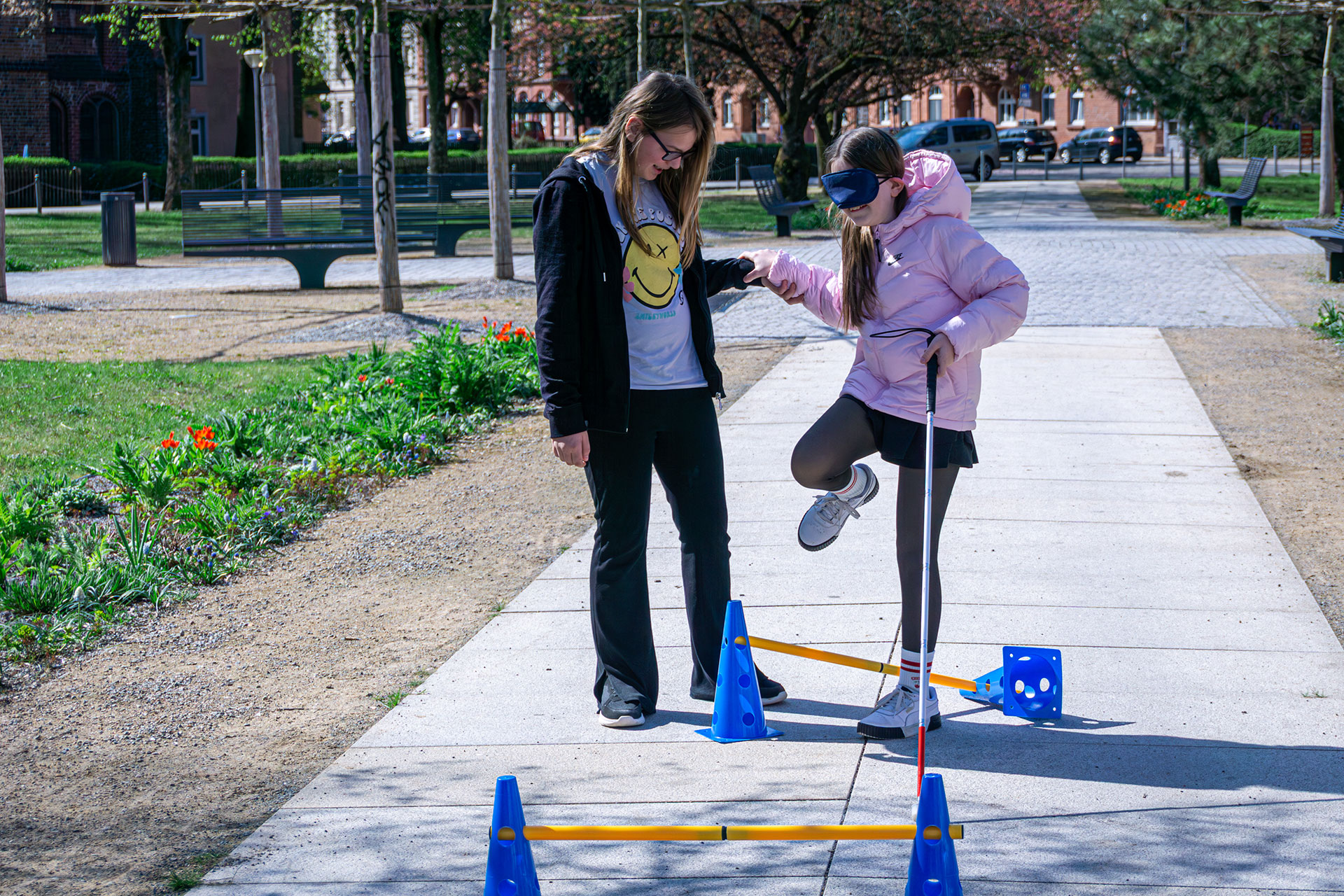 Besonders eindrücklich war der praktische Teil: Mit bereitgestellten Rollstühlen des Sanitätshauses AtO konnten die Schüler selbst erfahren, welche Hürden Bordsteine, enge Wege oder unterschiedliche Bodenbeläge darstellen. In einer weiteren Übung simulierten Schlafmasken vollständige Blindheit. Mit gefüllten Wasserbechern ausgestattet, erprobten die Kinder ihren Gleichgewichtssinn ohne visuelle Wahrnehmung und erhielten erste Einblicke in den Umgang mit dem Langstock.