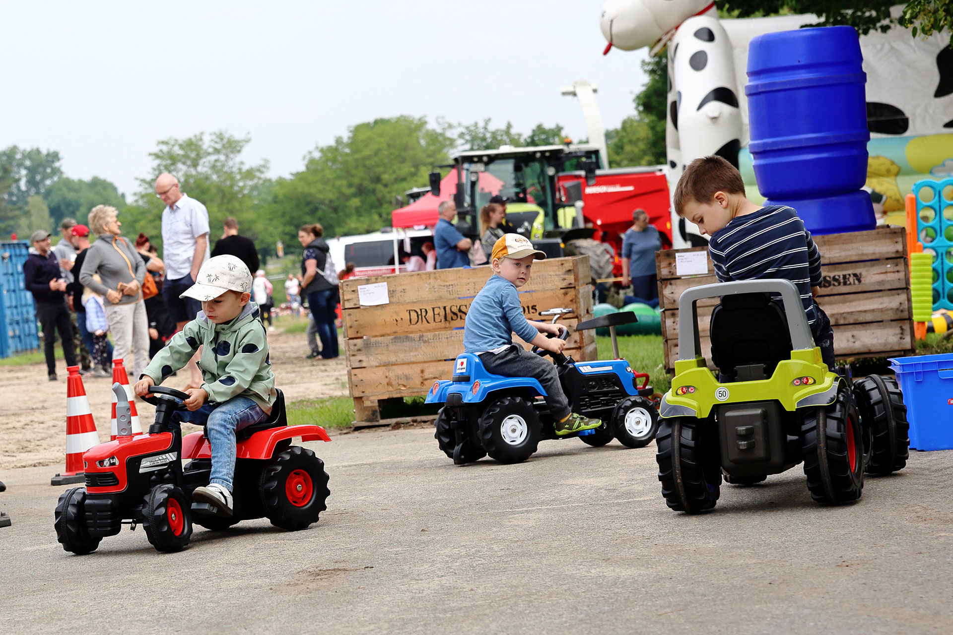 Danach war das bunte Treiben dann auch offiziell eröffnet, für die Jüngsten gab es die Möglichkeit, eine Riesenschaukel zwischen zwei Teleskopladern zu probieren oder mit Trettraktoren zu fahren. Vertreten war auch zwei Freiwillige Feuerwehr Stendal mit einem Wasserspiel. Die Hüpfburg lud zum Toben ein und auf der Traktor-Slackline war Balance gefragt. Mehrfach bot André Stallbaum auch Rundfahrten über den Betrieb an, um den Besuchern konkret zu zeigen, wie die Arbeit hier funktioniert und welche Produkte wachsen.