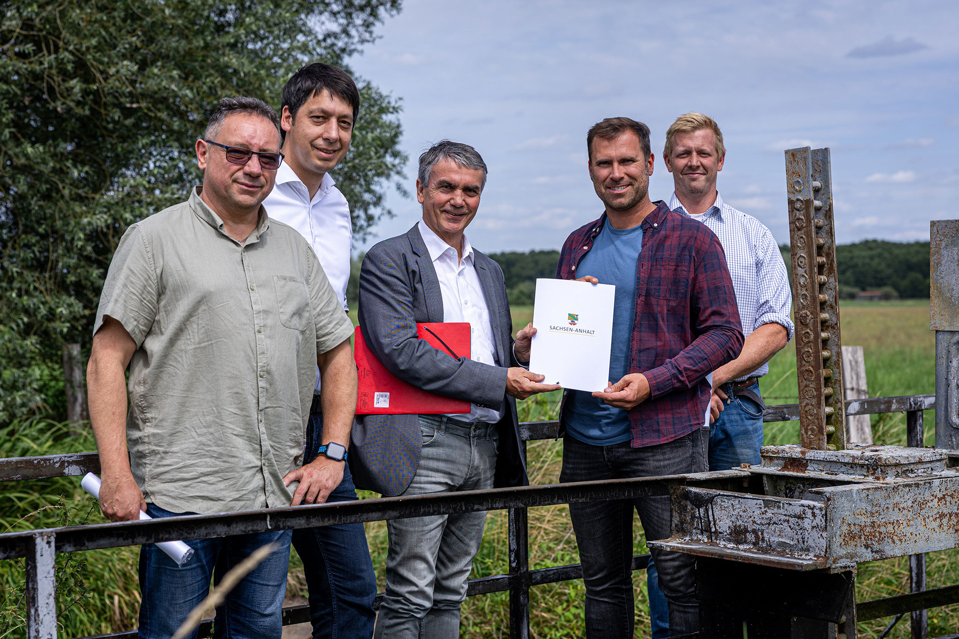Durch steigende Temperaturen sorgt der fortschreitende Klimawandel künftig für mehr Regen im Winter und längere Dürrephasen im Sommer. Damit es in Sachsen-Anhalt während der heißen Jahreszeit trotzdem genug Wasser gibt, muss vor allem in niederschlagsarmen Regionen mehr davon in der Fläche zurückgehalten werden. Wie dies im Niedermoorgebiet „Trüben“ gelingen kann, hat der Unterhaltungsverband „Trübengraben“ Havelberg (UHV) seit Ende 2022 in der ersten Phase eines vom Umweltministerium geförderten Pilotprojekts untersucht. Jetzt geht es an die Umsetzung: Den Anfang in Phase zwei macht die Sanierung einer Stauanlage bei Schönhausen (Elbe) – ebenfalls mit Unterstützung des Ministeriums. Am Donnerstag hat Umwelt-Staatssekretär Dr. Steffen Eichner im Beisein von Landrat Patrick Puhlmann dafür einen Förderbescheid aus dem Programm „Wassermanagement“ in Höhe von rund 224.000 Euro an den UHV-Vorstandsvorsitzenden Tobias Koch und UHV-Geschäftsführer Heino Sauer überreicht.
