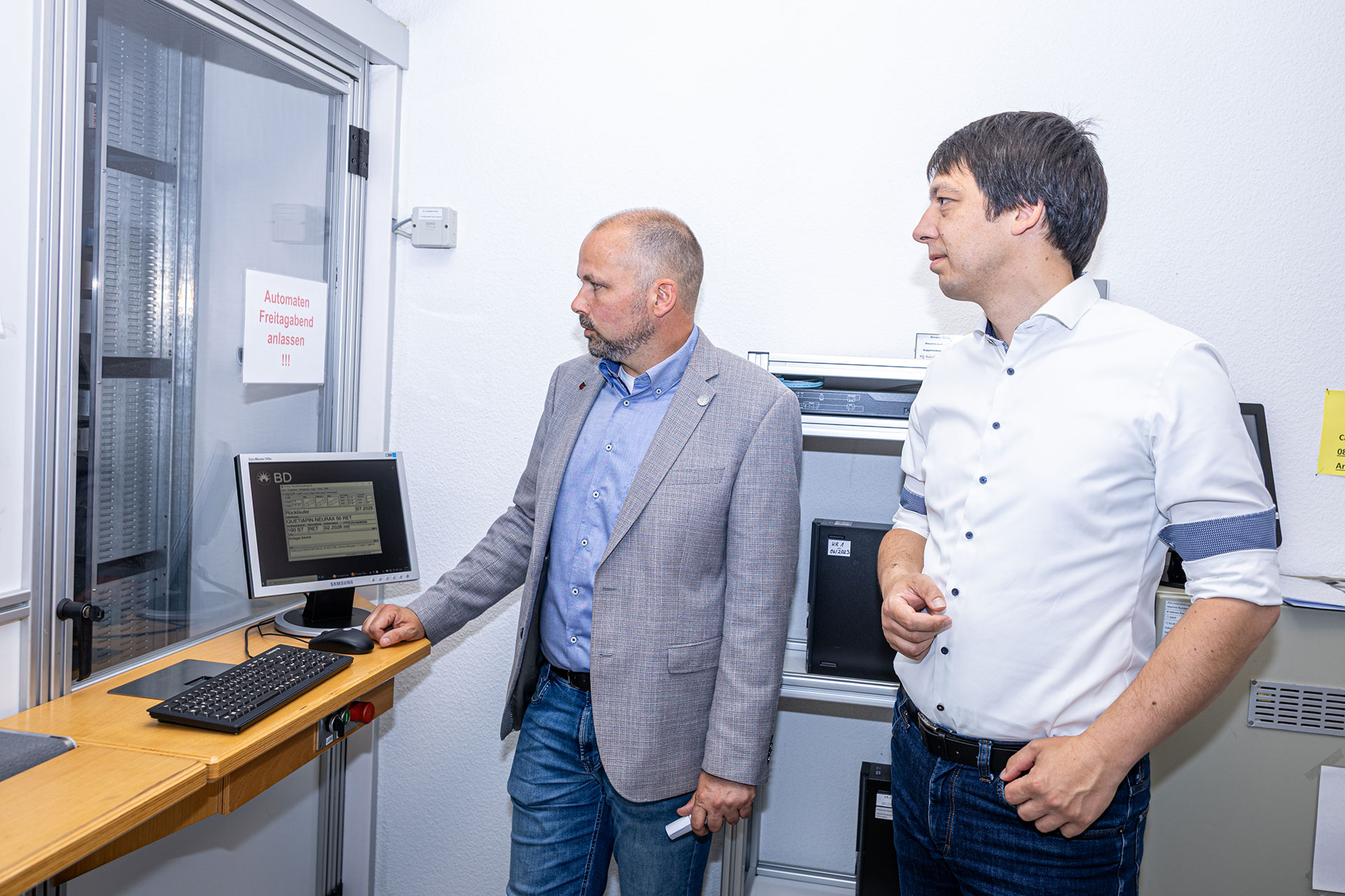 Im Jahr 1991 ist die Roland-Apotheke eröffnet worden. So haben Patienten der Fachärzte seit nunmehr 34 Jahren kurze Wege, um an nötige Medikamente zu gelangen. Wie der Landrat hinter den Kulissen erfuhr, hat sich seither aber jede Menge verändert. Zwar werden noch immer wichtige Arzneimittel auch selbst hergestellt, doch den größten Anteil bezieht das Unternehmen von mehreren Großhändlern. „Wir werden vier Mal pro Tag beliefert – und das obwohl 85 Prozent alle Medikamente permanent am Lager sind“, so Michael Handtke. Diese lagern allerdings heutzutage nicht mehr in den klassischen Apotheker-Schränken. Von dem automatisierten Medikamentenlager, einem der modernsten der Region, zeigte sich Puhlmann beeindruckt. Wenn am Tresen ein Medikament über den Computer angefordert wird, kommt es automatisch per Rohrpost aus dem Warenlager. „Wir merken natürlich den Druck aus dem Internet“, erläuterte Handtke und stellte Puhlmann vor, dass das Unternehmen neuerdings auch einen Online-Shop mit eigener App betreibt. Die Medikamente werden nach Bestellung bequem per Boten nach Hause gebracht.